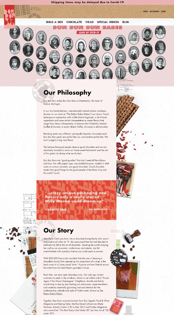 Bon Bon Bon, an artisanal chocolate-making company in Detroit, also runs an online store that is as creative and attractive as their chocolates. The website design is fun, and loud yet reinforces how fun and appealing their brand is!