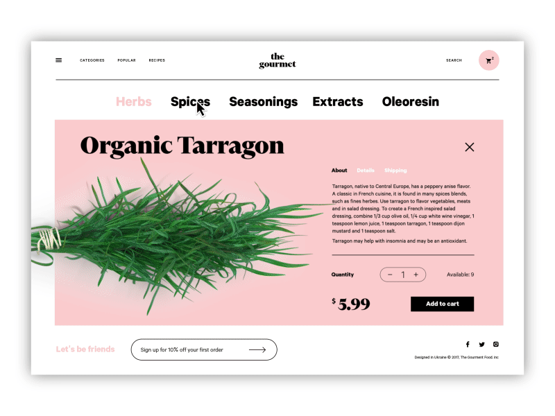 Shared below is a series of animated interactions in The Gourmet’s web design concept. As you can see, the visitor can easily move through the website, choose different categories and products, and add items to the shopping cart.