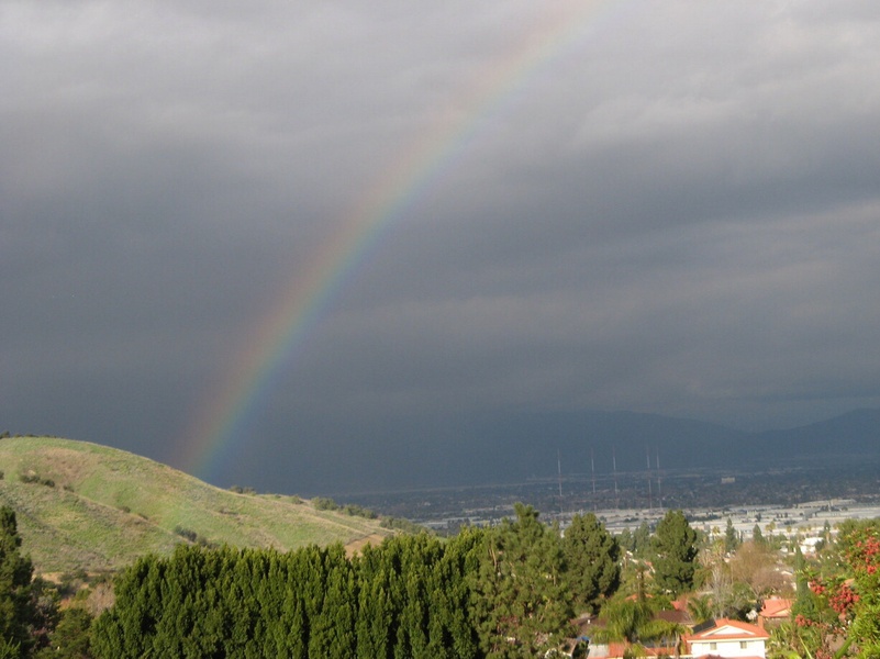 I did this photo yesterday during my visit to my grandma outside of Calgary. You can perfectly see the rainbow and little mountain, there was rain on one side and then it switched, and that's how you can see a rainbow! I love rain!!