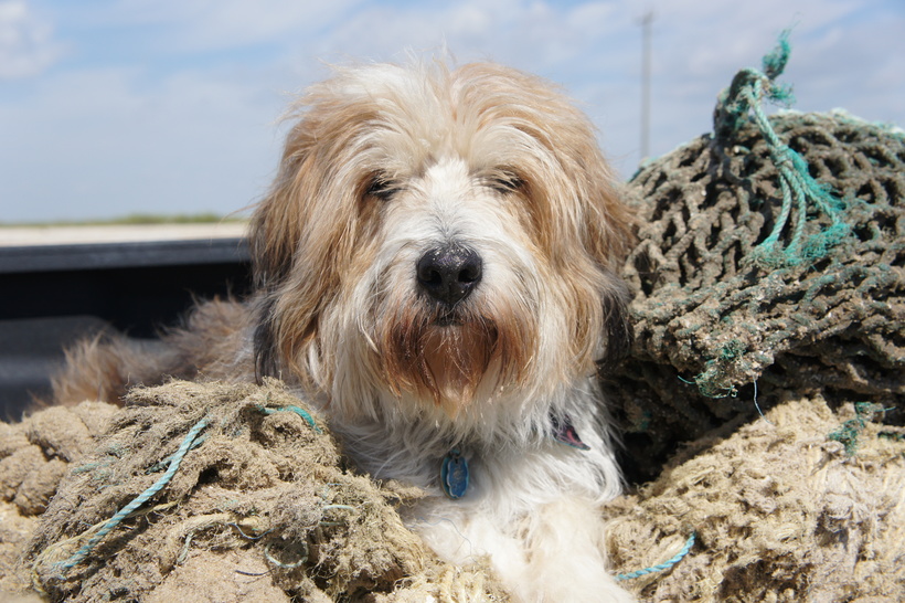 "HIPPY" IS CHILLING ON TOP OF THE SHRIMP NET AND ROPE THAT WE PICKED UP THAT AFTERNOON. LOVING LIFE AS LONG AS HE IS WITH ME!!