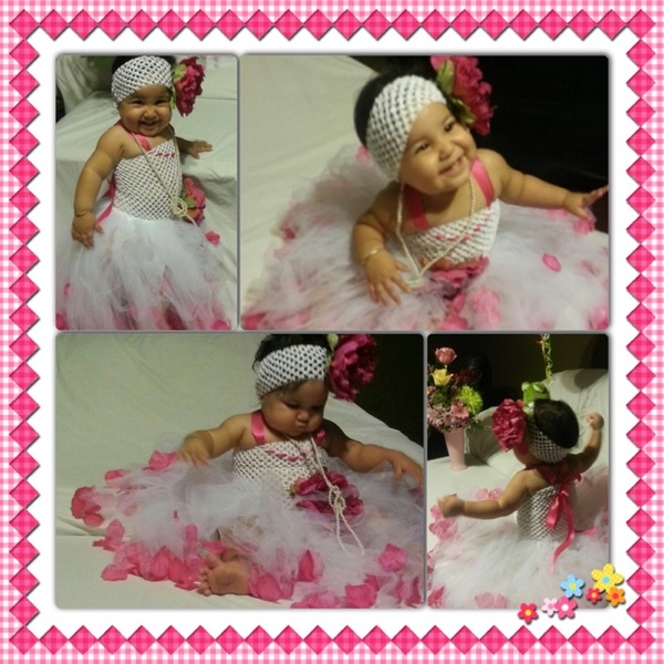 1 year old Scarlette Angel is wearing her birthday outfit...wearing a white crochet headband and a white tutu top from GCH! I accented them with pink flower clips, tule, and rose petals.