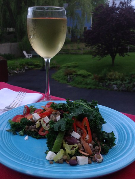 Greek Inspired Lentil & Kale Hand Rolls1/2 cup diced sweet onion1 tablespoon olive oil1 teaspoon dried Greek seasoning 1 cup green lentils, picked over and rinsed2 cups chicken broth1 clove garlic, roughly chopped2 bay leaves1/4 cup oil packed Kalamata olives, drained, pitted and diced8 large leaves fresh kale, rinsed6 oz feta cheese, cubed (or crumbles)4 mini red bell peppers, seeded and sliced in to rings6 pepperonicini Greek peppers, sliced1 small carrot peeled and shredded1/2 cup cucumber slices, cut in to strips2 cups halved grape tomatoes (optional)4 tablespoons prepared Greek salad dressing (optional)In a medium sauce pan, heat olive oil over medium heat. Add onion and Greek seasoning and cook until onions are translucent, about 10 minutes, stirring occasionally. Add lentils, chicken broth, garlic and bay leaves and stir to combine. Bring mixture to boil, reduce heat to low, cover and simmer for 35-40 minutes until lentils are tender and chicken broth is absorbed. Remove bay leaves, stir in diced olives and set aside.Meanwhile, bring a large pot of well salted water to a boil over high heat. Turn off heat and quickly dip kale leaves into the water to set the color and soften the leaves. Pat leaves dry with towels, cut off thickest part of the stem, up to the where the leaf begins, and peel back the most of the remaining center stem (the part that runs through the center of the leaf) so that what remains is soft and edible but leaves the leaf intact. A good part of the stem will peel off in strips, such as when peeling the tough outer layer off of a celery stick. Set leaves aside to cool completely.When ready to assemble hand rolls, spread the kale leaves on a flat surface and top each leaf with 1/4 cup of the lentil mixture and spread lentils down the center of the leaf. Top lentils with an 1/8th oz cubed feta, 1/8th of the bell pepper rings, 1/8th of the pepperoncini, carrots and cucumber slices and roll kale around the filling. Repeat with remaining lentils and kale.Serve immediately with a side of halved grape tomatoes with purchased Greek salad dressing if desired.Enjoy! Makes 4 servings of 2 hand rolls each