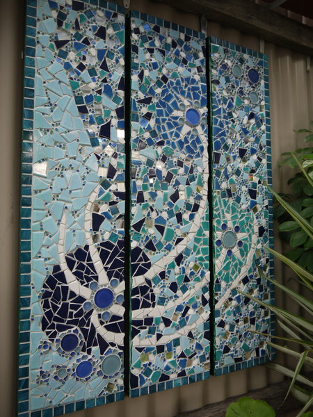 Garden Art - 3 panel abstract mosaic, featuring green and blue shades, something to brighten up the back yard