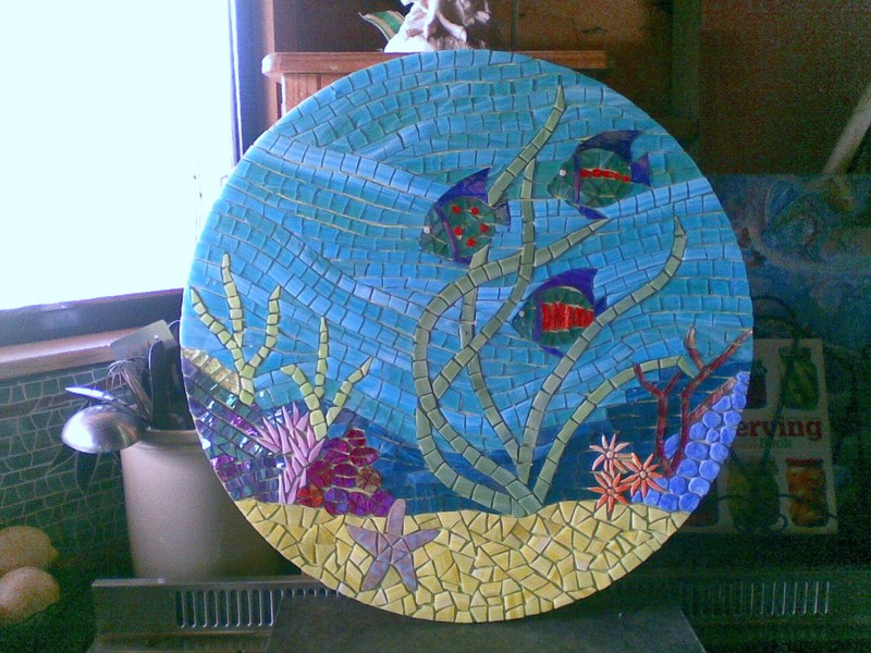 "underwater wonder" table top made out of glass and it has a matching mirror that is 3D