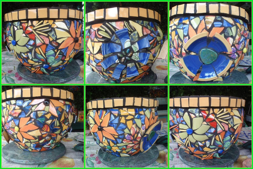 Mosiac pot using plate and cup tesserae