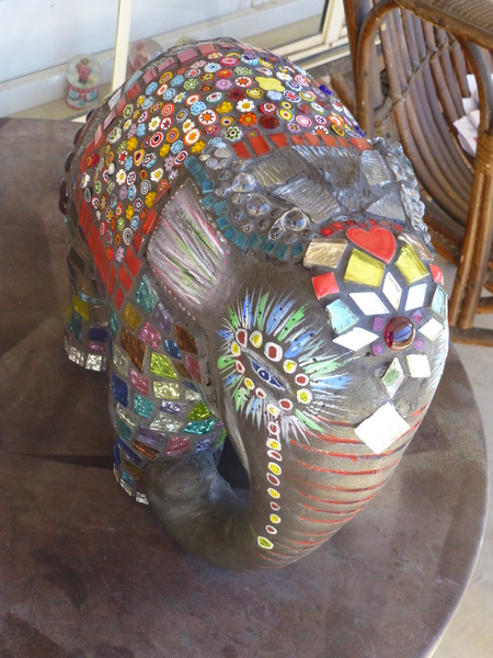 this is my elephant made for my daughter some glass plates,mosaic tiles and some painting were used