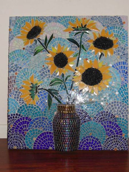 Sunflowers and vase - I was inspired by some beautiful sunflowers I bought and wanted to also incorporate some element of 3 D - so chopped a porcelain vase in half, covered it in gorgesous tiles and voila - Sunflower happiness!