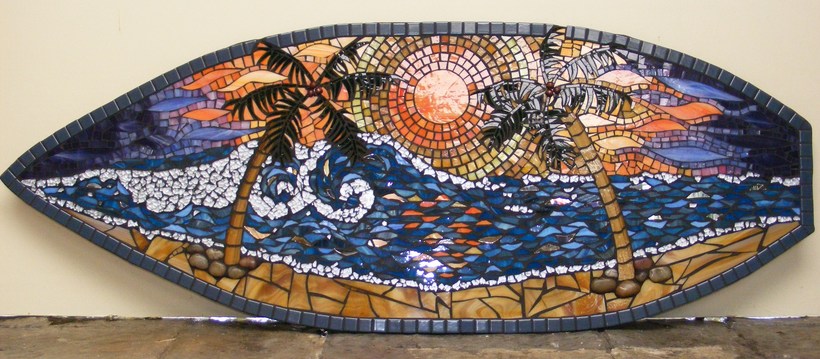 Aaron's Mosaic, fibre cement board cut to shape, glass, pebbles, mirror, TG, beads, tiles.