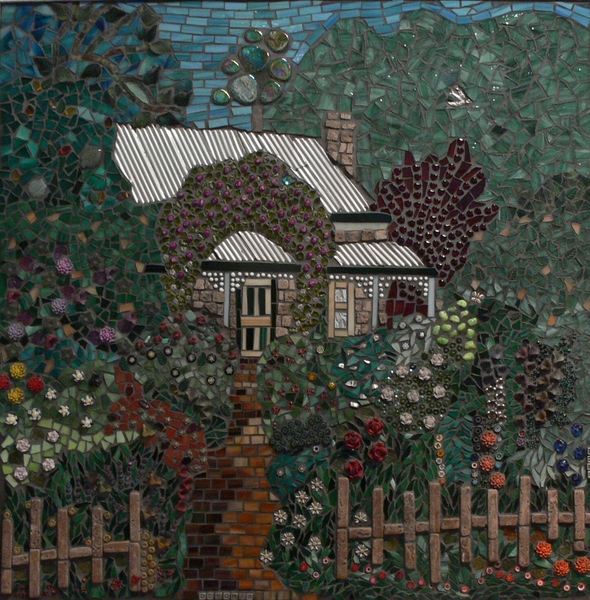 Devonia- A Cottage Garden. Based on the 2012 Womans Diary and our house in Sale Vic Devonia. This mosaic is made on Marmox with glass, beads, metal roof, stone, and flower. Made from the heart it is one of my favourites.