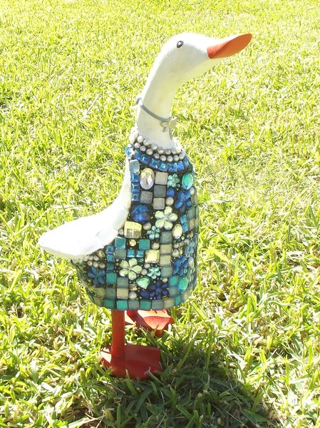 Irma La Duck Wooden duch with Beads Glass Smalti, Hand made skirt from fire glass mesh.