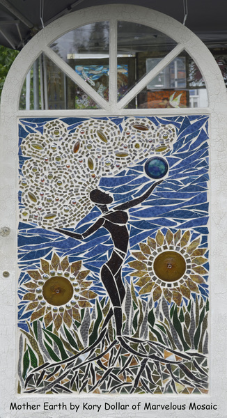 “Gaia, Mother Earth “ by Kory Dollar of Marvelous Mosaic Size: 28 x 54 Materials: 2 vintage 4 inch diameter glass hand spun and mouth blown rondlas, one unique ceramic blue sphere, 9 oblong amber hand pressed jewels made in Portland, Or in the 80s.