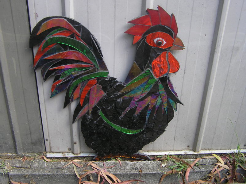 My rooster is mosaicked on to hardboard cut to shape. It is all glass. Diane Reardon