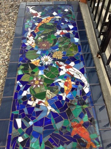 Stained glass mosaic : Koi pond (67 in. x 28 in.) on sidewalk gate entryway