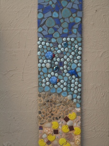 This is a sample piece that was to be for a much larger project. It is a picture that represents the sand, sea and sky. I have made use of different coloured grouts to define the water and sand.