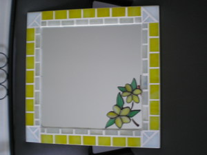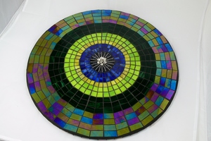"Centred" Made on a wooden Lazy Susan this mosaic was fun to make. Made with Iridised black glass and greens and yellows with a gorgeous metal rose in the centre. It looks amazing when spinning & can be used as a piece of practical art or hung.