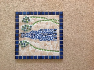 Made at local Primary School with children's help. Recycled china, glass, glass beads and marmox.