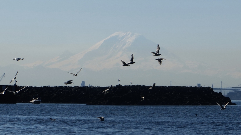 Gulls outlined against Mt. Rainier