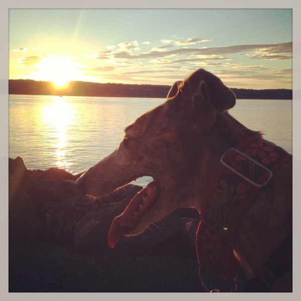 My dog Koza enjoying the sunset and the beach in Mukilteo