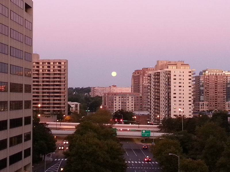 Harvest moon setting early morning view from my Crystal City patio. I love the views, I love the park, and I love the trees in this neighborhood.