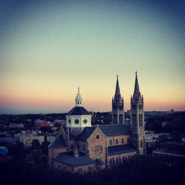 The church outside my window with a pretty pink and blue sunset in the background. Boston, MA.